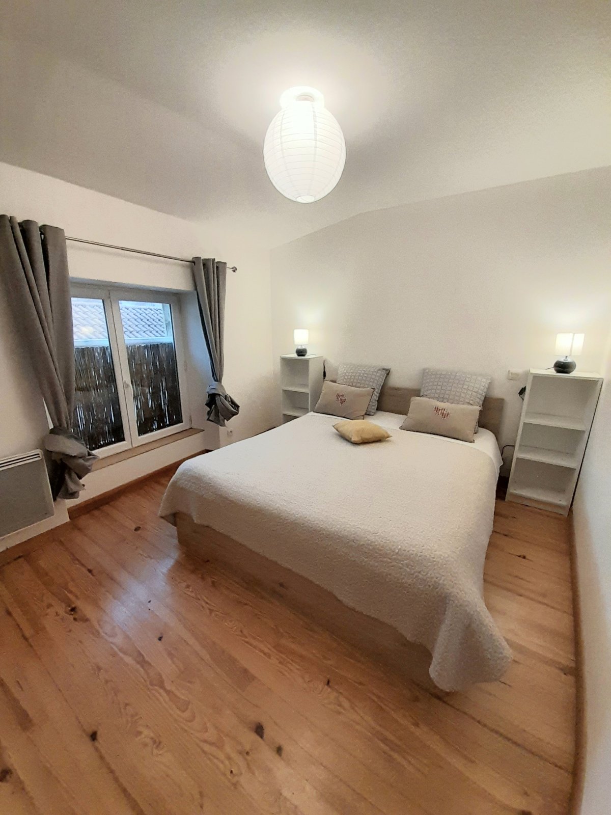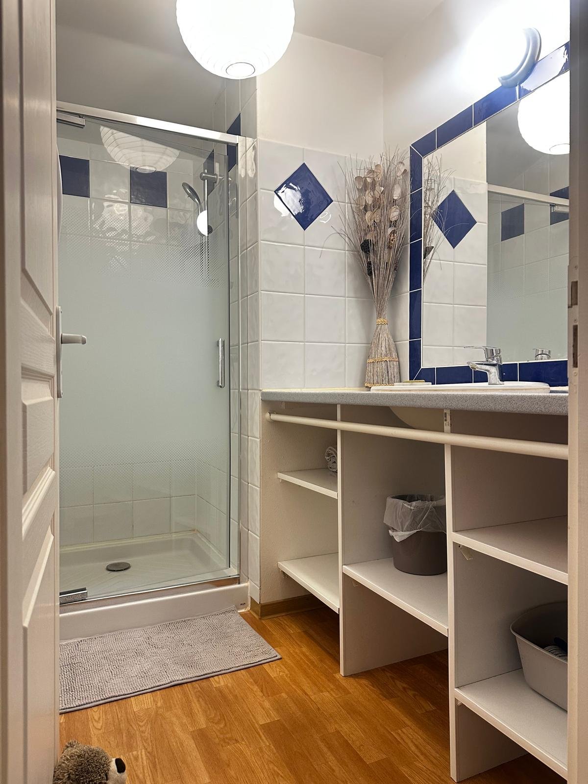 Entre les deux chambres vous trouverez une salle d'eau, avec grand espace de rangement. Une douche avec une paroi en verre.