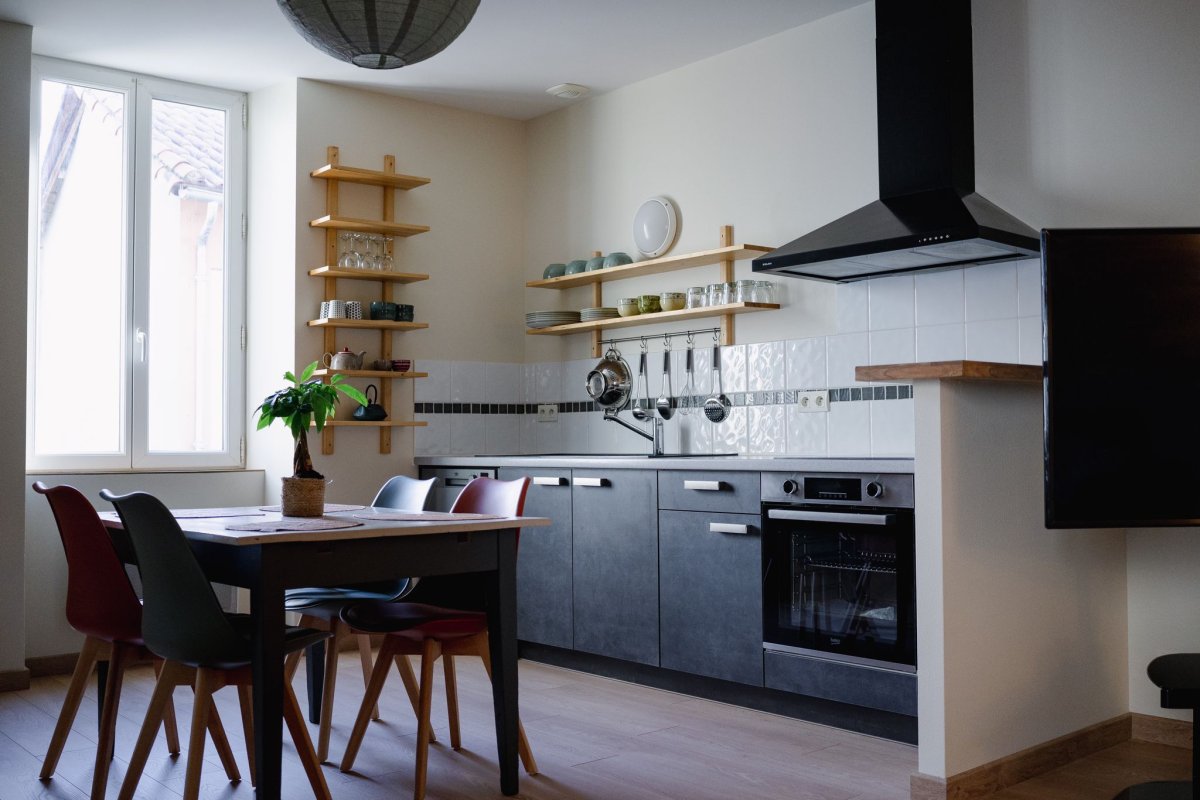 Une grande pièce de vie comprenant une cuisine équipée confortablement :